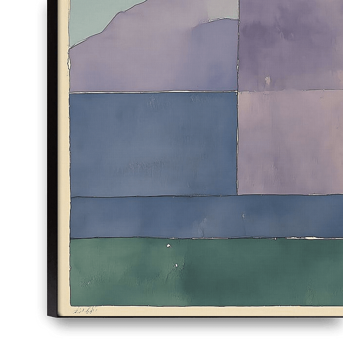This painting depicts an abstract landscape composed of soft, geometric planes in shades of blue, purple and green. At the centre stands a stylised plant with round, orange fruits, which provides a warm contrast to the cool background. The shapes are reminiscent of a city or a hilly landscape, yet remain deliberately simplified and…
