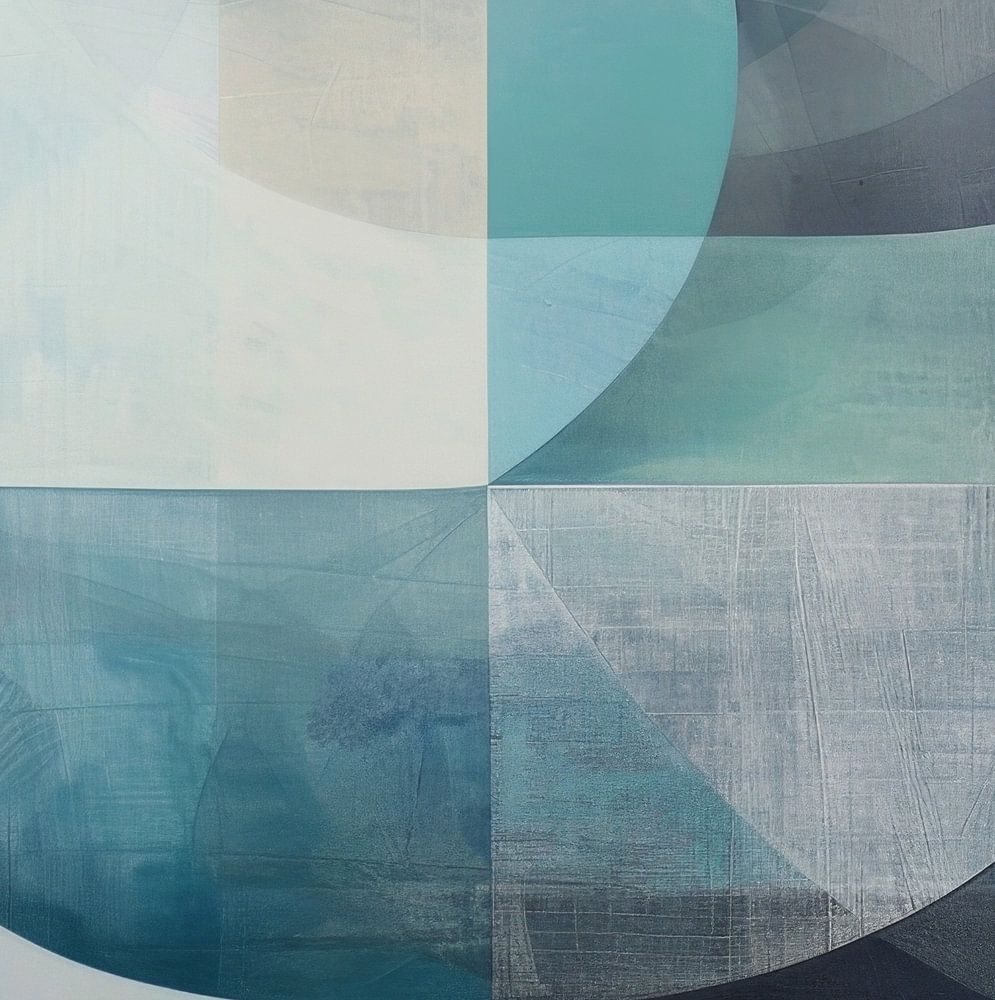 This impressive abstract work of art captivates with its harmonious colour palette of blue and green tones arranged in geometric shapes. The smooth transitions and clean lines create a calming yet dynamic atmosphere. Ideal for modern living spaces, offices or creative workspaces looking for a stylish and inspiring wall decoration. This piece brings an elegant calm and timeless aesthetic to any room.