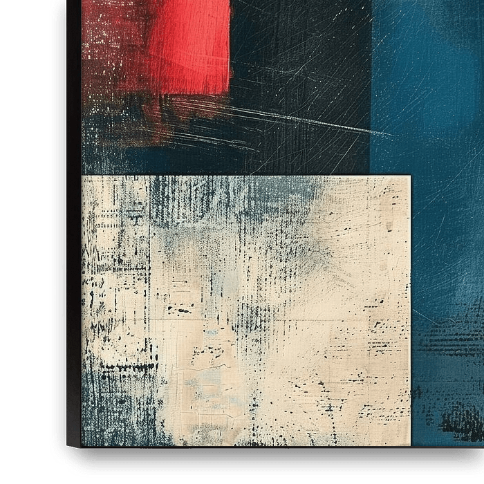 A visual experience that combines the essence of abstract art with a touch of retro. Clean lines and geometric shapes in a palette of deep black, bright red and various shades of blue, reminiscent of the industrial aesthetic of the city. The weathered textures and worn edges give the image a raw yet intriguing depth. Perfect for art…