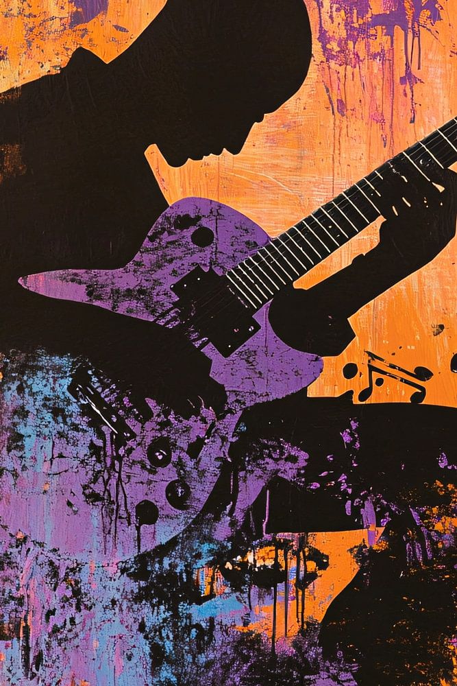 This unique artwork shows a silhouette of a guitarist against a vibrant, abstract background full of dynamic colours. Perfect for music lovers and art collectors, this painting brings an energetic and creative atmosphere to any room. The bright hues of purple, orange and blue combined with the black silhouette make this piece a striking and artistic focal point. Ideal for modern living rooms, offices or music studios, this design gives a fresh look to your interior. Add this inspiring piece to your collection and enjoy the musical vibes it exudes daily!