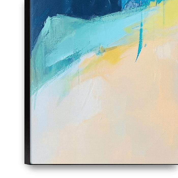 Gentle waves of blue and yellow merge in harmonious unison, while the atmosphere conveys a calm expanse. The vibrant colour palette is reminiscent of a clear sky over rolling hills. Ideal for a living room, it provides light and creates a relaxing, positive mood that takes the edge off everyday life and invites you to linger.