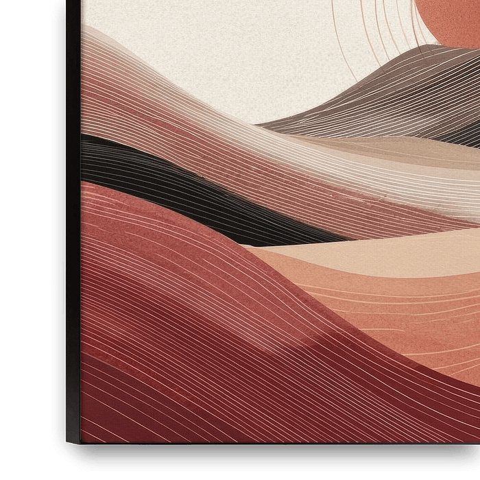 This serene abstract landscape features flowing, undulating lines in warm earth tones reminiscent of sand dunes or gentle hills. The rising sun, rendered in terracotta, is surrounded by subtle circular lines, creating a sense of tranquillity, rhythm and balance. The delicate line structures and soft colour gradients give the piece a…