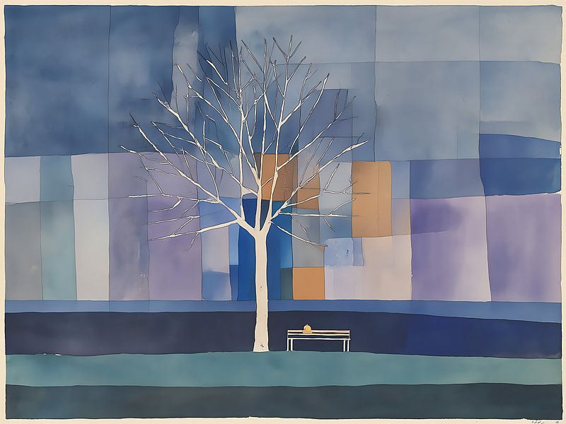 This painting depicts a stylised tree with a full, rounded bare crown, set against a background of soft, geometric planes in blue, purple and beige. Beneath the tree stands a simple bench, upon which a small figure or object rests, adding a subtle human element to the otherwise abstract composition. The atmosphere is quiet and…