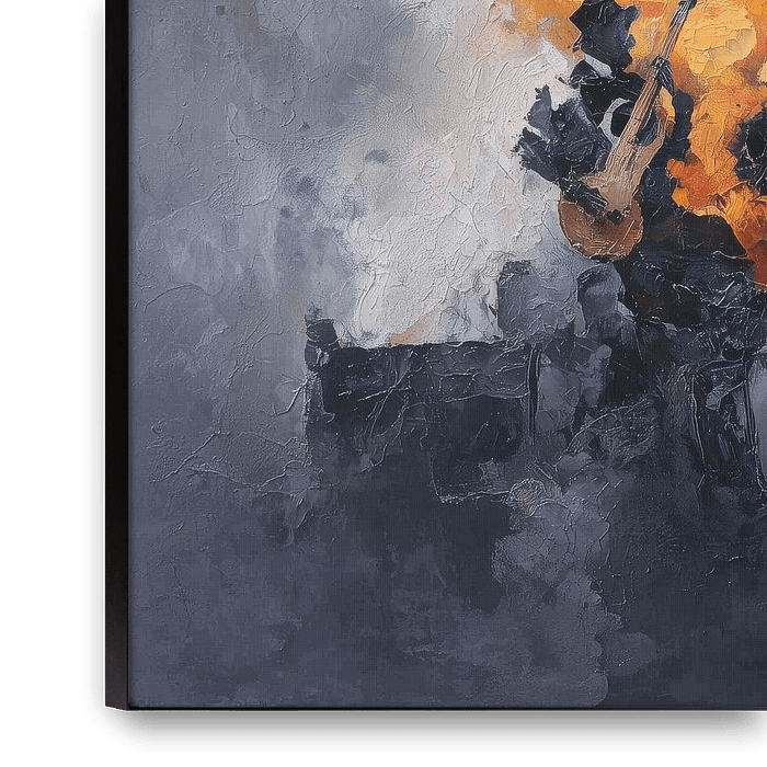 Abstract musicians grey-yellow-pink painting captures the energy of live music in a modern and expressive composition centred around three musicians: two guitarists and a drummer. The artwork translates sound and rhythm into abstract forms and flowing lines, making movement almost tangible. The musicians seem to merge into the…