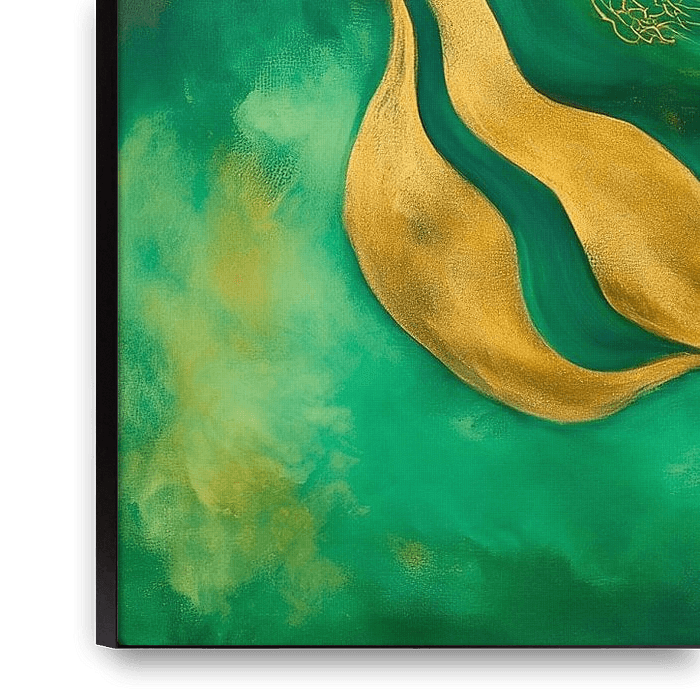 Elegant, curved lines in bright gold dance on a soft emerald green background. This harmonious composition radiates calm and creativity and invites you to dream. Perfect for a living room or a creative office, where it brings inspiration and stimulates conversation. An absolute highlight for any room!