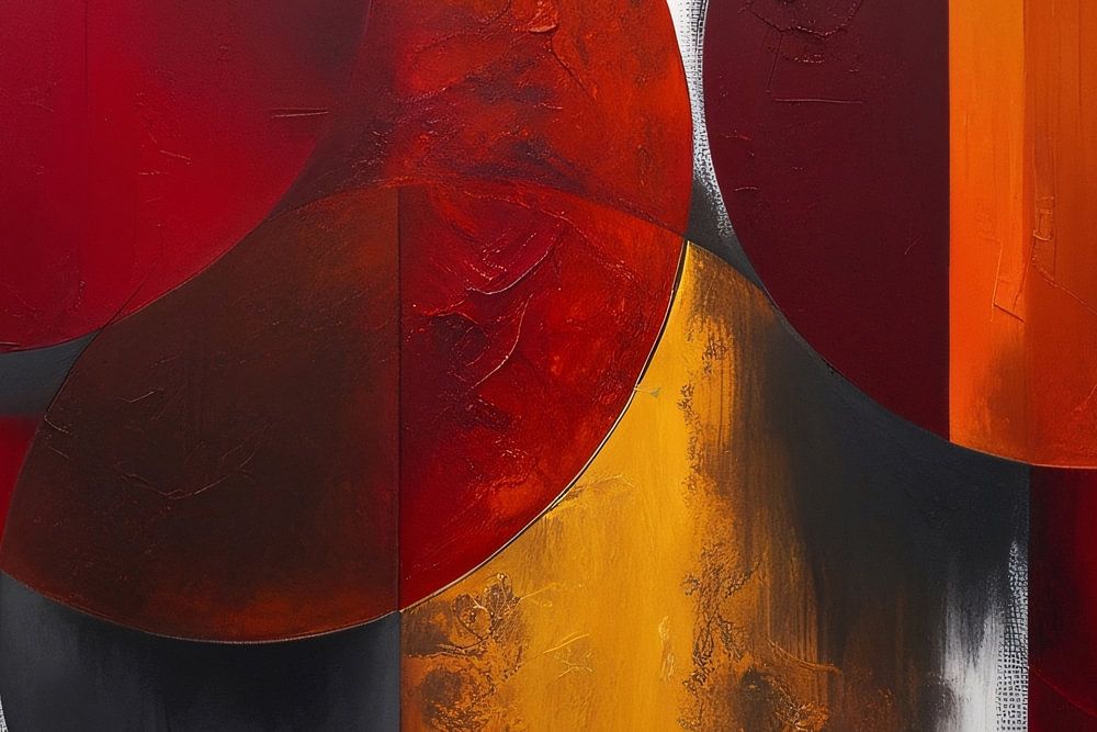 This dynamic abstract artwork attracts attention with its overlapping of large circles and rectangles in rich, warm tones. The use of red, orange, yellow and black creates a powerful play of colours that evokes a modern and expressive feel. It is a perfect choice for anyone looking to enrich their space with a contemporary artwork that exudes energy and style. This painting fits well in modern interiors and is sure to make a statement in living rooms, offices or other spaces that could use a touch of creativity and colour.