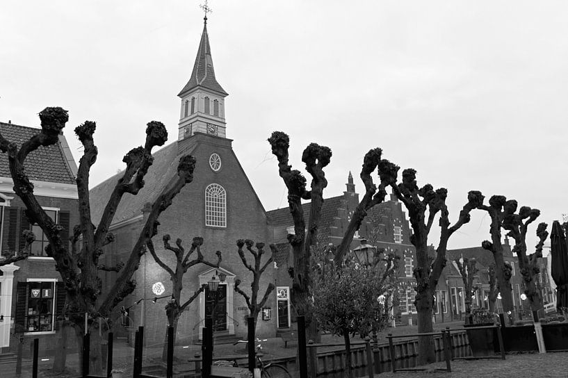 Black-and-white image of church in Sloten with a beautiful row of graceful pollard willows in front of it.