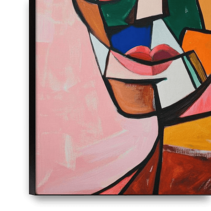 A fascinating interplay of colours and shapes unfolds where geometric fragments animate a face. The soft, blue eyes shine under a simple, thought-provoking expression. A harmonious dance between warm and cool colour tones transforms the contours into an inviting work of art that awakens the senses and encourages interpretation.