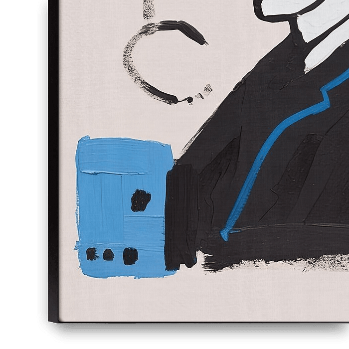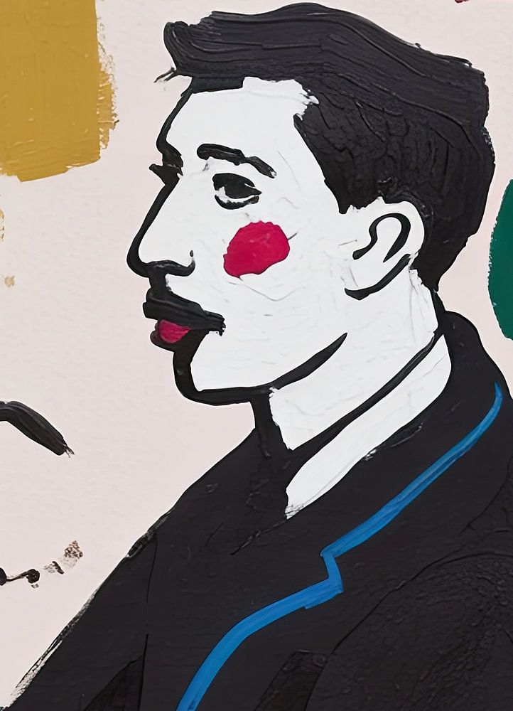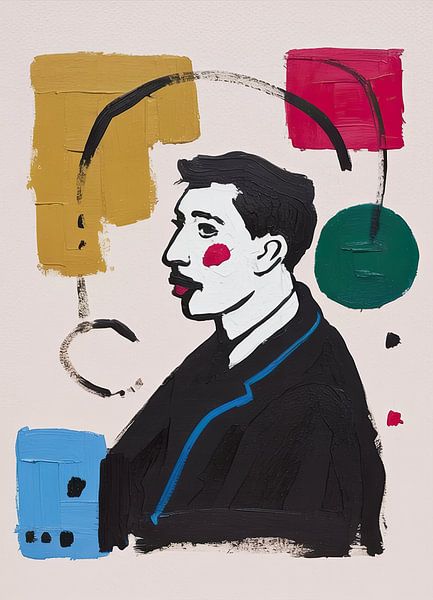This graphic illustration shows a portrait of a man in a minimalist style. The face and upper body are rendered in striking white, accentuated by red cheek markings and a dark moustache. The man wears a black jacket with a blue vertical stripe. Abstract geometric elements are arranged around the head: a blue rectangle with dots, a large…