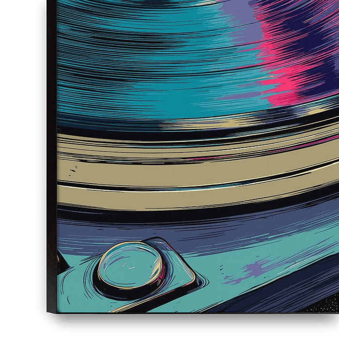 This impressive artwork depicts a record player in abstract, vibrant colours. The rich tones and dynamic lines give the image an energetic atmosphere. Ideal for music lovers who want to add a creative touch to their space. Perfect as a decorative element in music rooms or modern living spaces.