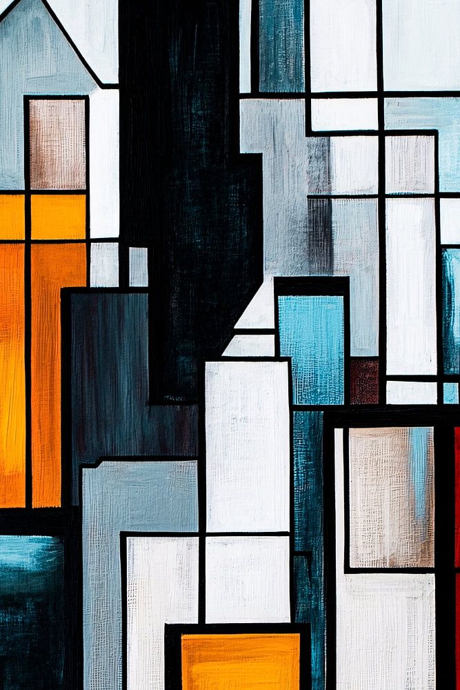 This abstract rendering of a skyline combines modern art with geometric shapes and contrasting colours. The design highlights urban architecture through the use of straight lines and bold colour blocks, creating a powerful and dynamic effect. Perfect for interior designs that want to make a statement, this artwork brings a mix of sophistication and energy to any space. Ideal for modern living rooms, offices or other contemporary spaces. A visual celebration of the urban world, this piece adds a unique touch to any environment.