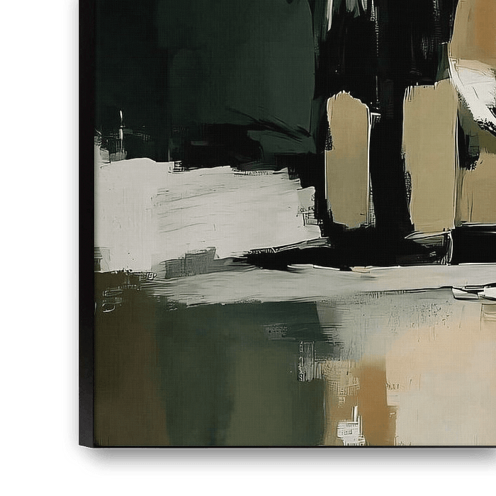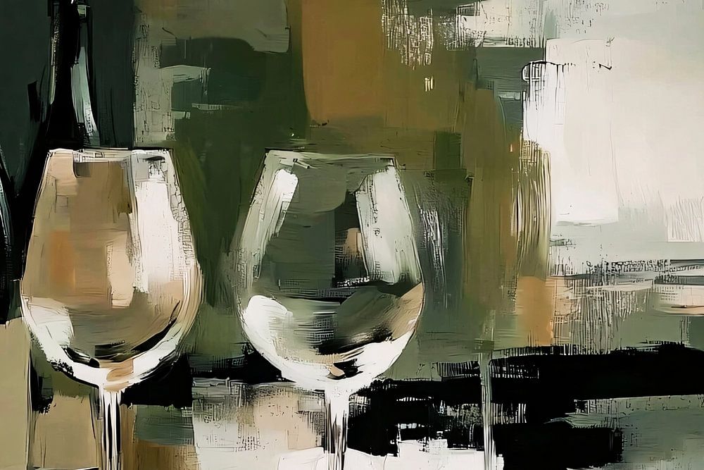This abstract artwork is a modern interpretation of a classic still life. The dynamic brushstrokes and harmonious colours create an atmospheric image that fits perfectly into any interior. The design shows a beautiful interplay of glasses and bottles, combining soft shades of green, beige and white with darker accents. This composition exudes elegance and tranquillity, making it suitable for spaces such as the living room, dining room or a stylish office. An ideal decorative piece that adds subtle sophistication to your surroundings.