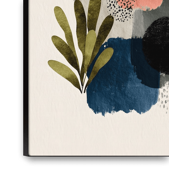 A playful abstract artwork featuring organic shapes, dots and subtle leaf motifs in shades of blue, pink, cream, ochre and black. The layered composition and visible brushstrokes give the work depth and movement, while the soft colour palette creates a warm and harmonious look. Perfect for a boho, modern or creative interior.