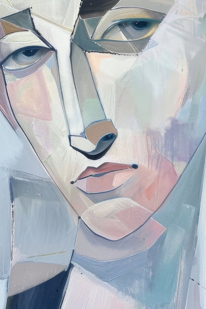 This stunning portrait of a woman in a cubist style combines pastel shades of blue, beige and pink to create a harmonious composition. The face, abstracted in geometric planes, radiates a fascinating calm and grace. The modern, clean lines and soft colour palette make this work of art a perfect eye-catcher for contemporary living spaces. A must-have for art lovers who appreciate elegance and sophistication.