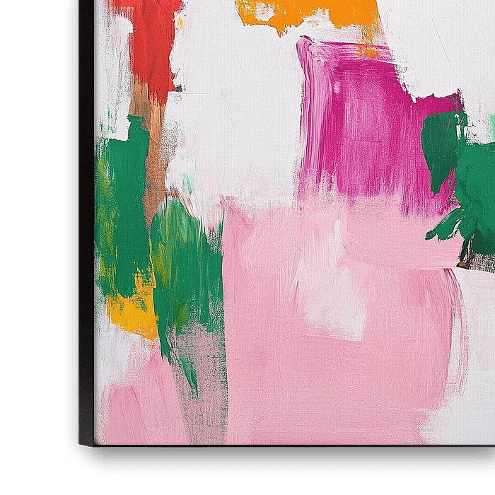 A vibrant abstract painting with bold brushstrokes and a mixture of bright colours including pink, green, yellow, red, orange, white, magenta and purple. The background is white, creating a contrast between the soft edges and the sharp lines of the brushstrokes. In some areas where thick layers of colour create a tactile feel, the emphasis is on the texture of the artwork. This work contains elements that resemble natural forms, adding depth and movement to the composition.