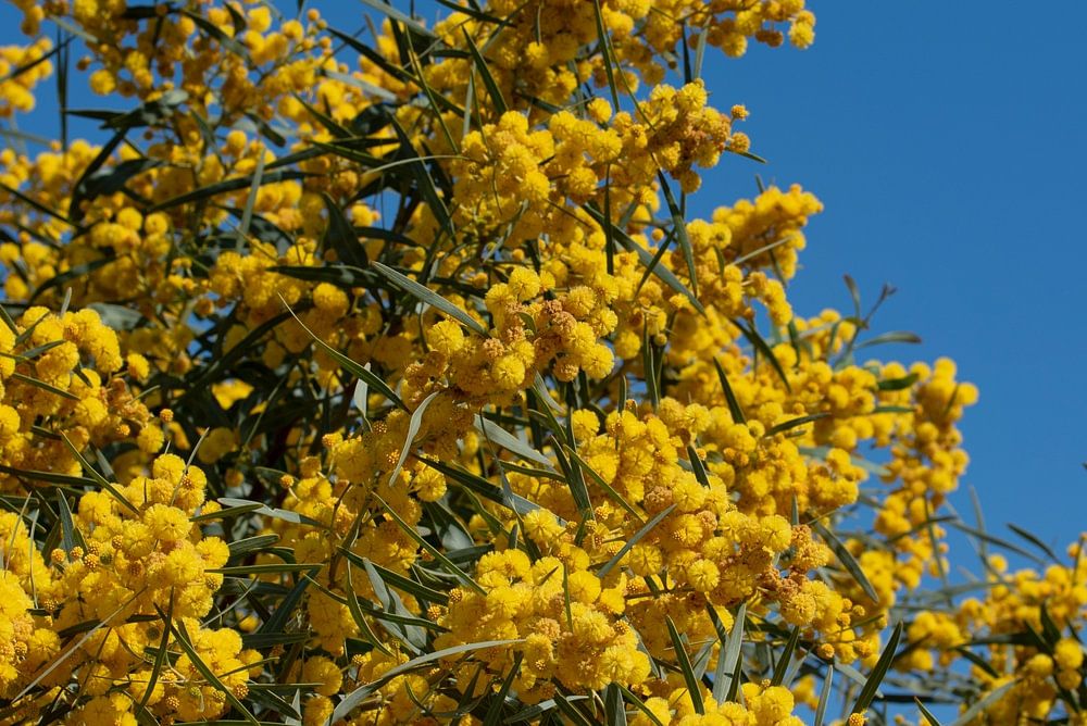 Buy this flower art Acacia dealbata against a blue sky by Ulrike Leone on canvas, ArtFrame, poster and wallpaper, printed on demand in high quality.