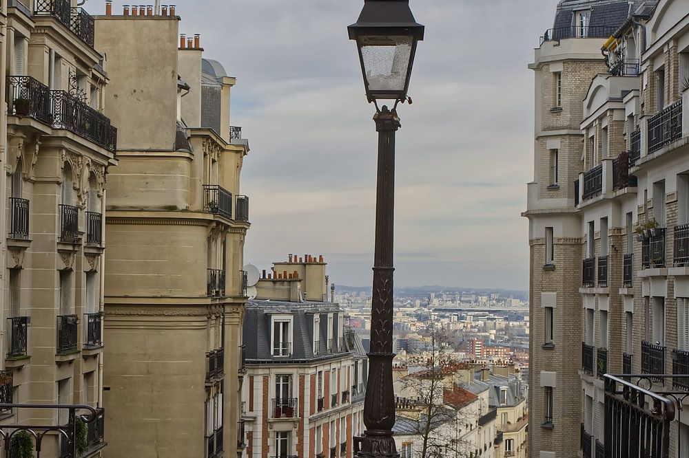 A lamppost marks the entrance to the steps of Rue du Mont-Cenis. One of the connections between the high and low parts of Montmartre. When you think of Paris you think of the Eifel Tower but certainly also Montmartre with the Sacré-Coeur and the picturesque Place du Tertre.