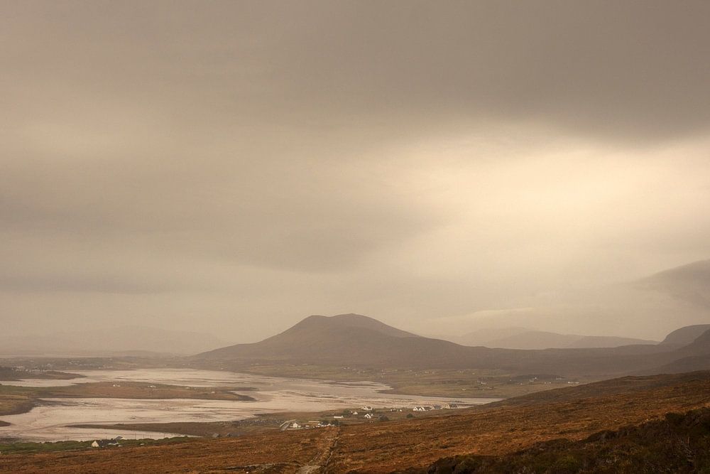 A wintry day with low hanging clouds over Achill Island and Blacksod Bay in County Mayo, Ireland