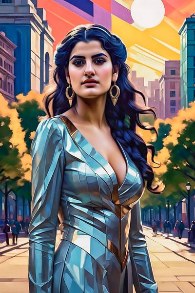 Adelina presents a stylised and glamorous depiction of a woman in an urban setting that mixes elements of Art Deco with modern digital painting techniques. The degree of abstraction here is relatively low. Although the image is clearly a graphic design and not a photograph, it strives for a strong 3D effect and a high level of detail,…