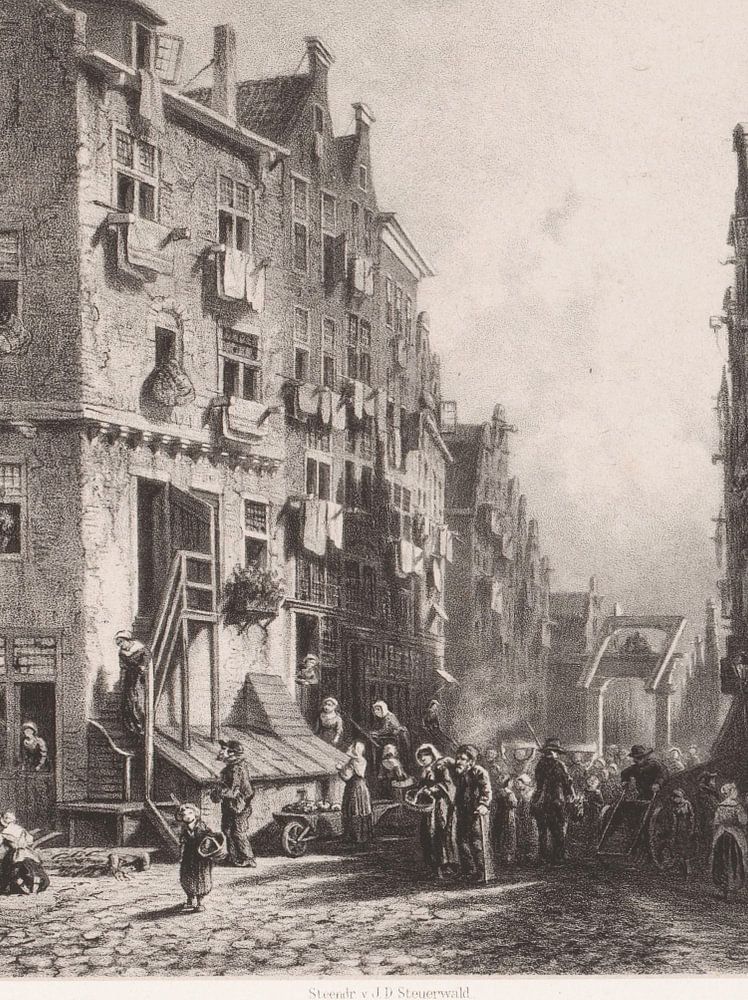 The Jodenbuurt or Jewish Quarter in Amsterdam was a neighbourhood inhabited by Jews from the late 16th century onwards. It stretched along Jodenbreestraat, Uilenburg, Vlooienburg, Waterlooplein, Rapenburg and Nieuwe Herengracht, later also Nieuwmarkt, Sint Antoniesbreestraat, Plantage, Weesperstraat and Weesperplein to Nieuwe Kerkstraat.