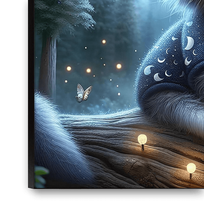 A fluffy kitten with striking blue eyes is seated next to a warm cup on a wooden surface, surrounded by a mystical night setting with fireflies and a full moon in the backdrop. The ambient light from the moon and fairy lights creates a serene and enchanting atmosphere as the kitten gazes forward with an endearing expression.
