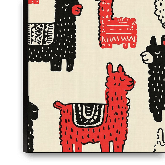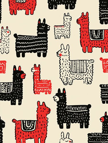 This cheerful and graphic artwork features a repeating pattern of llamas and alpacas in black, white and red. The simple, hand-drawn style gives the work a playful and accessible feel. Each llama has subtle differences in coat texture and decorative details, making the pattern feel lively and full of character.