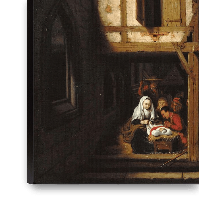 In this painting, Nicolaes Maes almost exactly copied Albrecht Dürer's 1504 engraving of the Nativity. Maes simply widened the house to the left, provided new poses for the Virgin Mary and baby Jesus, and added the four shepherds that give the painting its new subject. The harmony of blacks, browns, and whites that he chose emphasizes the painting's origin in a print. He successfully used the fluid medium of oil paint to render such textures as the stable's wooden door, the exposed bricks, and the thatched roof.