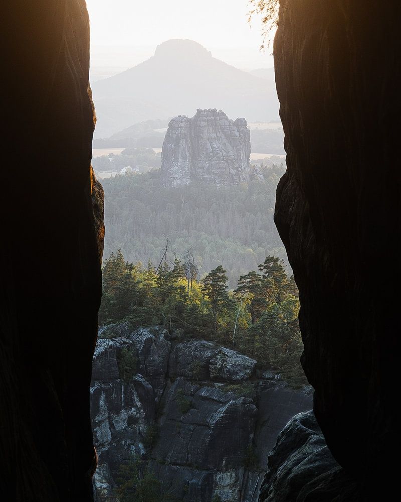 This photo shows an impressive view in Sächsische Schweiz national park, Germany. The image was taken from a narrow rock crevice, giving you a view through to the rocks and forests beyond. The descending sun casts a warm light over the surroundings, bathing the rocks and landscape in soft hues. The hike to this spot was challenging, but the effort was rewarded with this special viewpoint. The depth of the gorge creates a unique composition that evokes a sense of adventure and discovery.