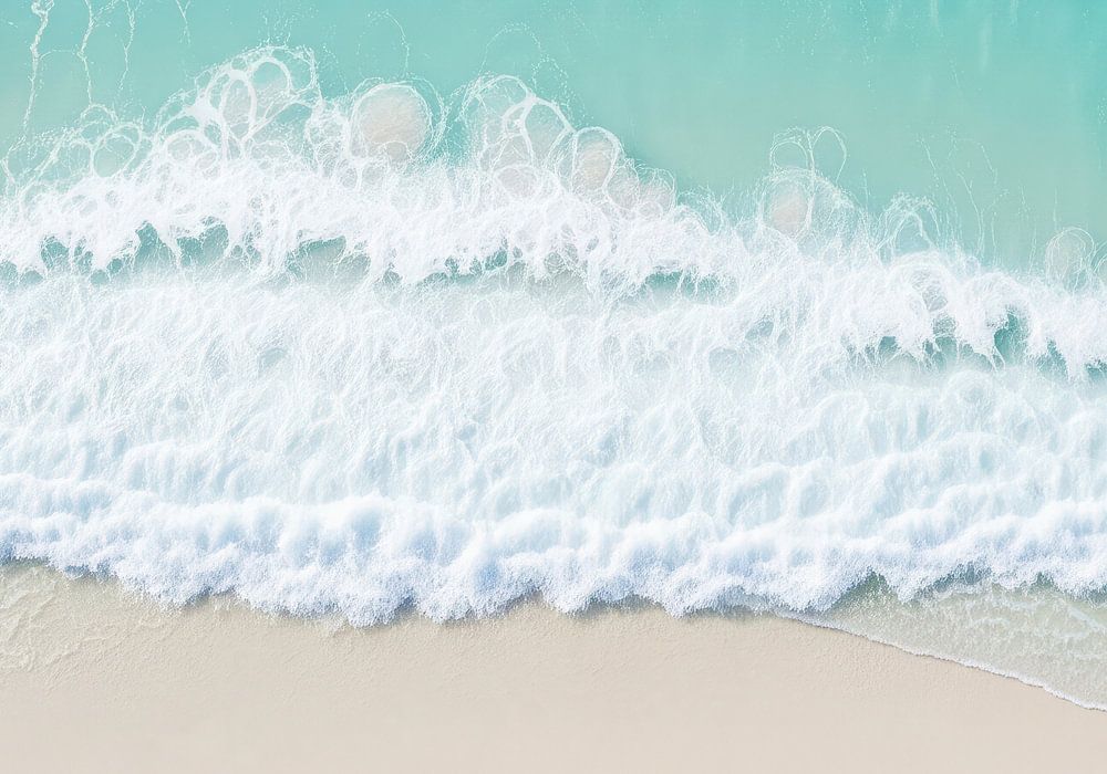 Aerial view of a beach: white sand meeting turquoise water with white foamy waves, shot from directly above.