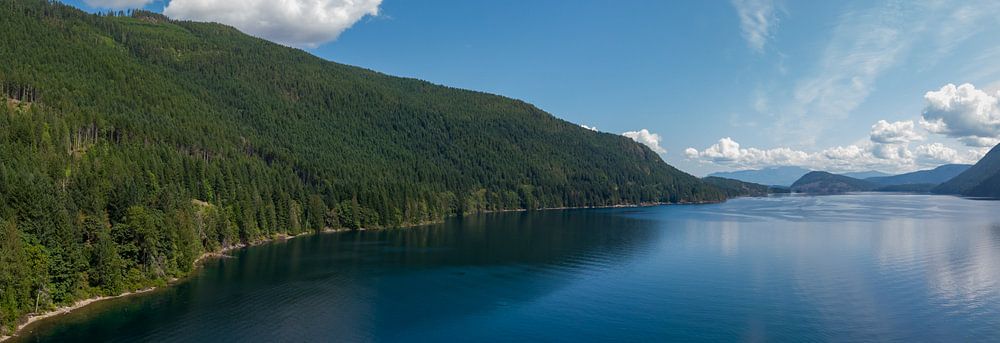 Aerial panorama of Sproat Lake in Canada with forest and reflection of the sky in the lake by Hans-Heinrich Runge