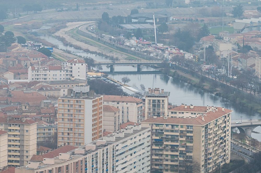 Ales, Occitanie, France, 12 30 2022 - Aerial panorama over the city, with the river Gardon
