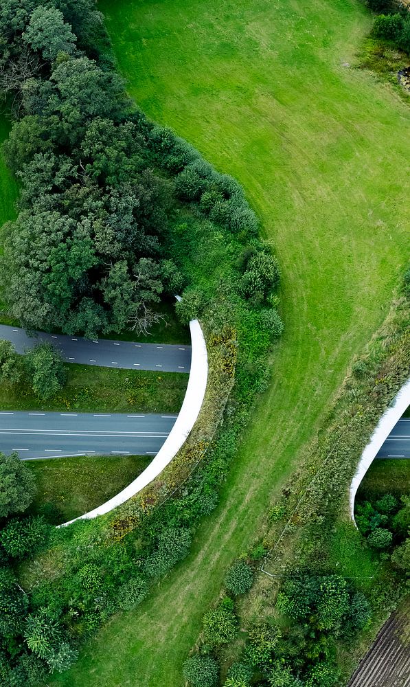 Dutch landscape with ecopassage viaduct seen from the air as wildlife crossing.