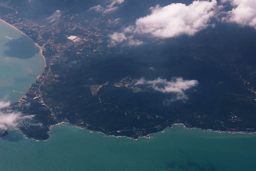 A picture taken from the air of the Thai coast with sea, land, cloud cover, sun and shadows. The photo was taken during a trip around the world from Thailand, Asia.