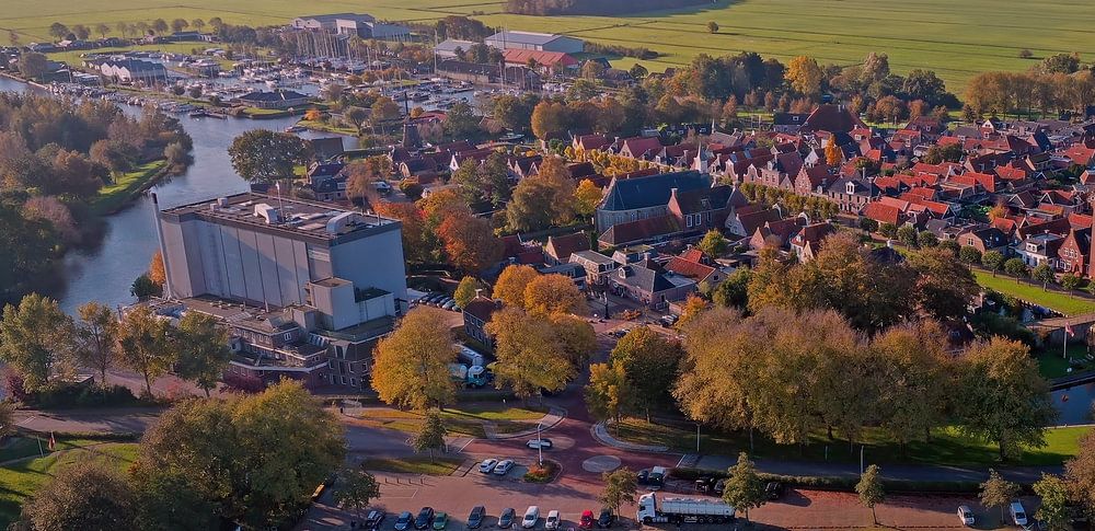 About "Aerial photo of the town of Sloten in Friesland Netherlands at sunset"