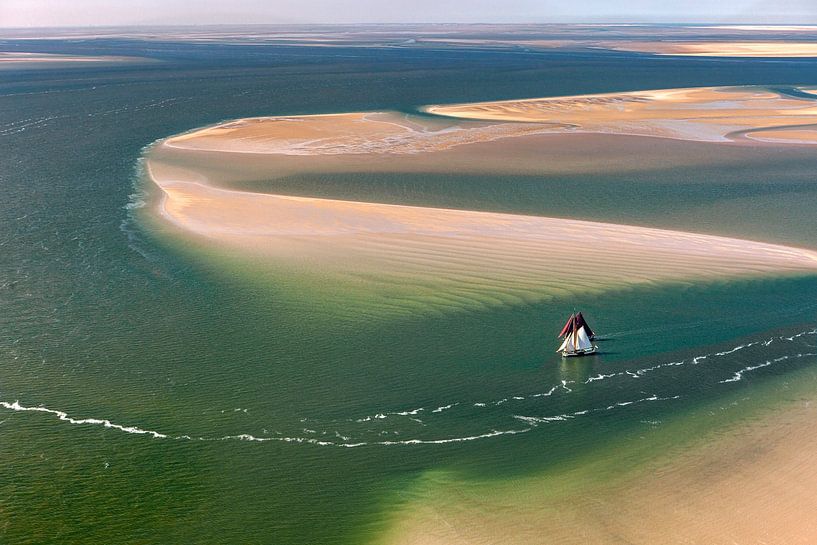 Aerial photo of two boats of the Brown Fleet at low tide in the Wadden Sea near Terschelling, the Netherlands.