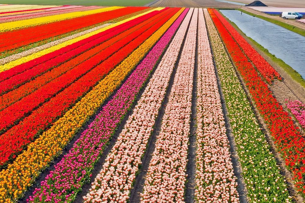 Aerial view of flowering tulip fields near Lisse in the Netherlands