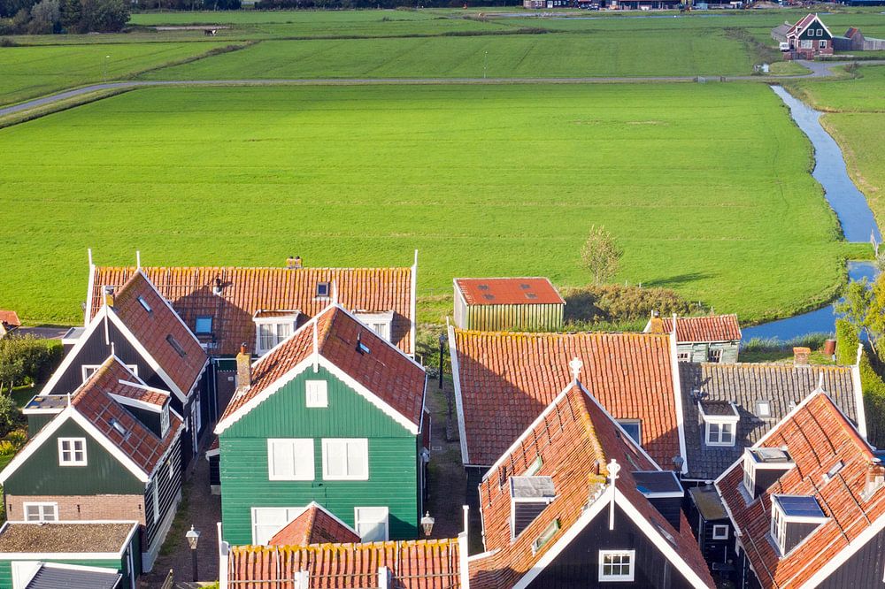 Aerial view of old Dutch houses on the dike near Marken in the Netherlands