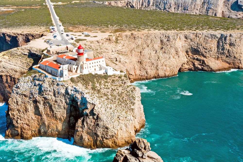 Aerial view of the Cabo Vicente lighthouse near Sagres in Portugal Europe
