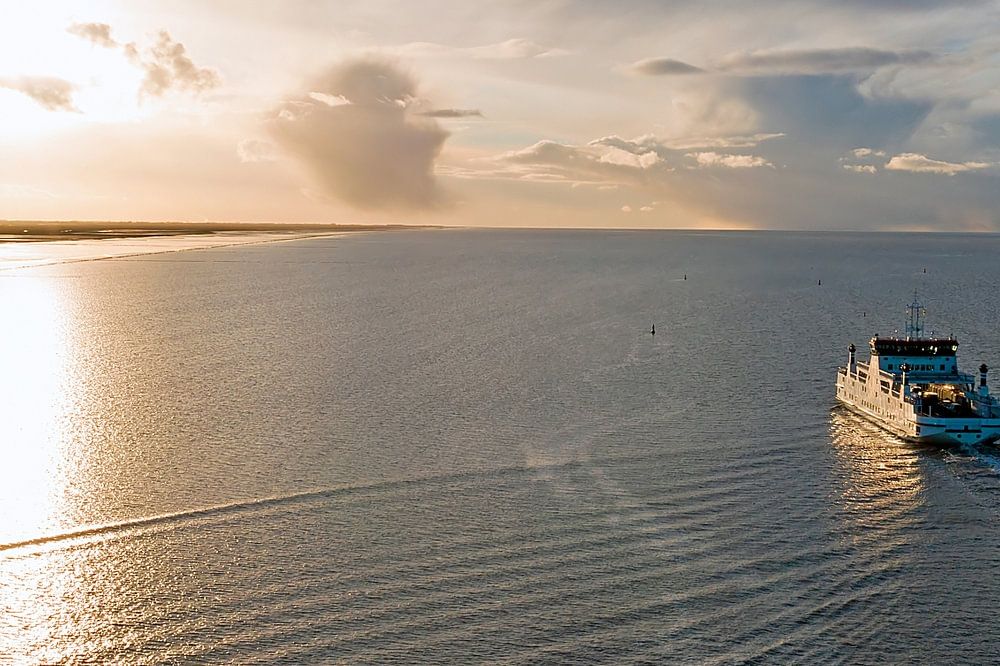 Aerial view of the boat to Ameland on the Wadden Sea at sunset in the Netherlands
