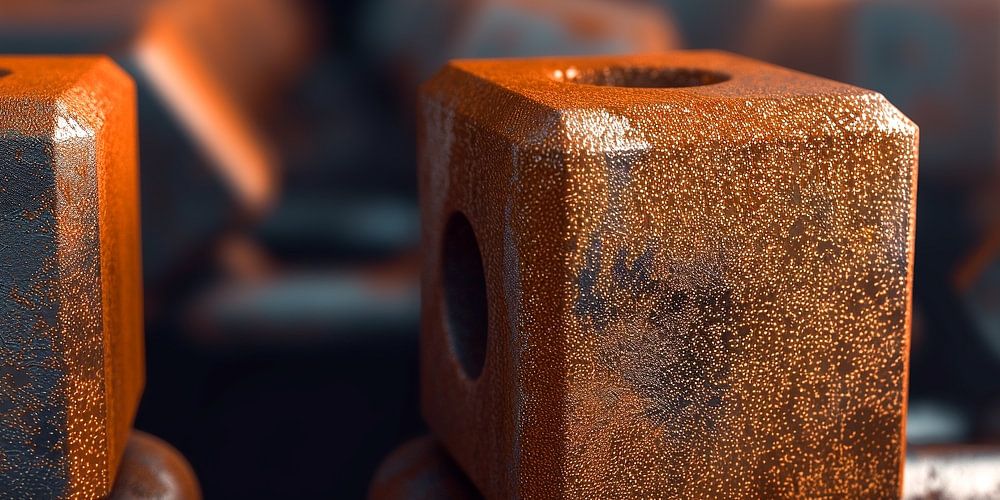 Rusty steel blocks in the centre of the picture against a blurred background stand for strength and durability despite decay and ageing. The work reflects the contemporary preference for materials and their ageing processes in conjunction with minimalism, which is emphasised by the clear composition and concentration on the essentials.