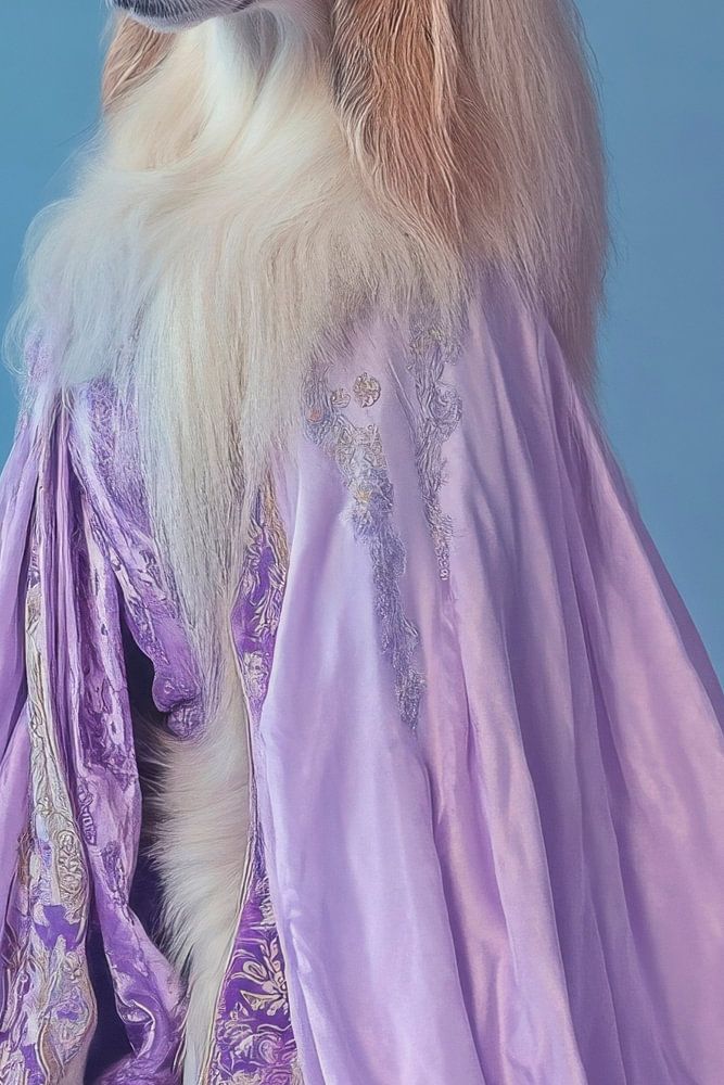 With majestic grace and a feather-light, silky coat, the Afghan Hound presents itself in all its splendour. Its elegant ears fall gently, while a touch of glamour is added by the purple drapery. The unmistakable facial expression radiates both intelligence and dignity, making this noble companion the epitome of grace and luxury.