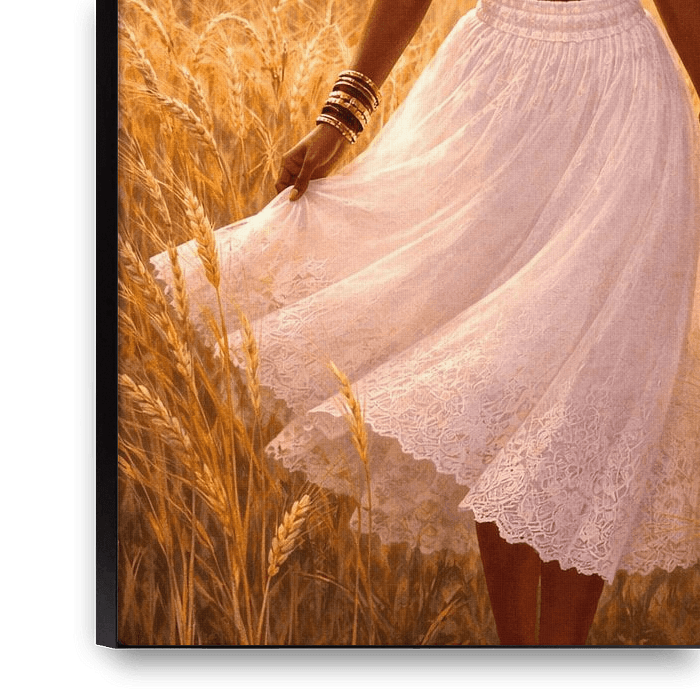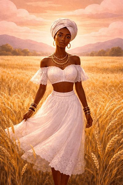 This stunning artwork features an elegant African woman standing in a golden wheat field at sunset, dressed in a flowing white dress and traditional headwrap. The warm golden light and natural landscape create a serene and powerful portrait celebrating beauty, culture, and strength. Perfect for boho interiors, modern living rooms,…