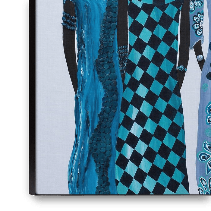 Nalah shows a group of African women who together form a powerful and energetic ensemble. Their slender silhouettes are enveloped in dresses in sparkling shades of blue. The soft, neutral background highlights the figures beautifully and enhances the sense of movement and life in the painting. Each woman has her own pose and appearance,…