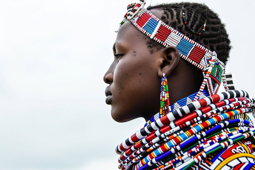 This fascinating portrait shows the majestic beauty and cultural depth of African traditions. The detailed depiction of the beaded ornaments and the bold colours of the clothing create an impressive contrast to the fine, shaded facial features. Each bead and thread tells a story of identity, pride and culture. Ideal for lovers of…