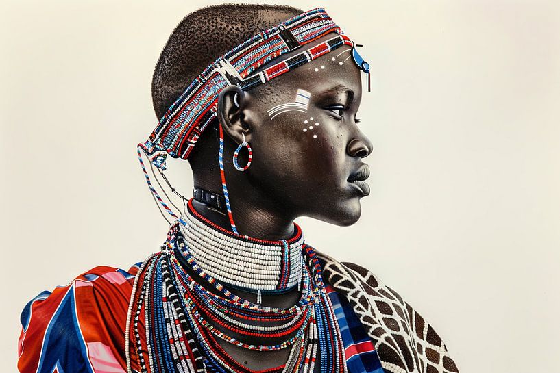 This fascinating portrait shows the majestic beauty and cultural depth of African traditions. The detailed depiction of the beaded ornaments and the bold colours of the clothing create an impressive contrast to the fine, shaded facial features. Each bead and thread tells a story of identity, pride and culture. Ideal for lovers of…