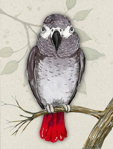 A watercolor drawing of a African grey parrot. The bird sits on a branch with side branches and looks at you sweetly. You see the bird from the front and he looks straight at you, you see both eyes. He looks relaxed. Behind the bird you see a leaf motif with twigs and a warm paper texture.