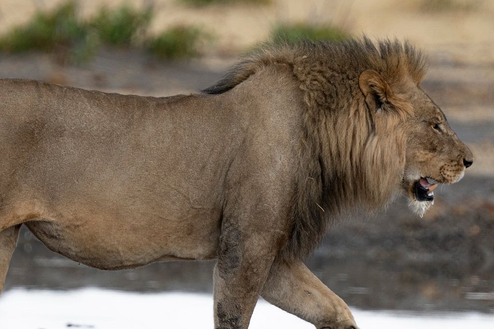 African lion walking at waterhole in Namibia, Africa by Patrick Groß