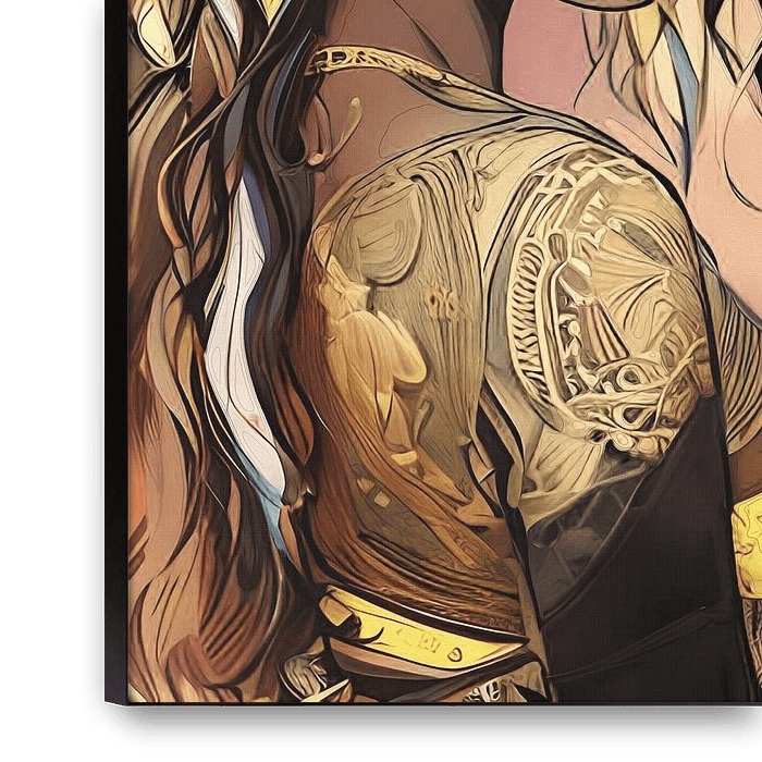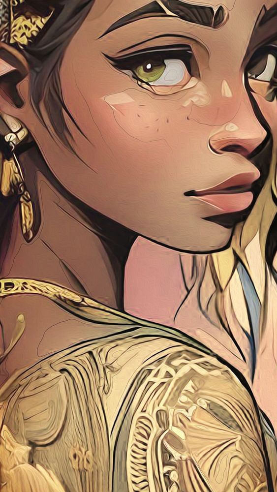 Artwork of an African young woman with golden colours. This woman looks over her shoulder with an innocent gaze. This artwork was created using ai, based on a hand-drawn pencil drawing. I optimised the coloured version of the ai output with digital drawing.