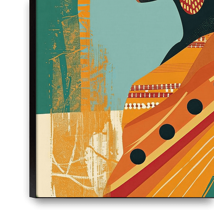 This abstract depiction shows the profile of an African woman in traditional dress, artfully rendered in bright colours and geometric patterns. The striking shapes and harmonious colour palette emphasise cultural diversity and elegance, while the tastefully arranged accessories highlight her grace and dignity. This modern interpretation…