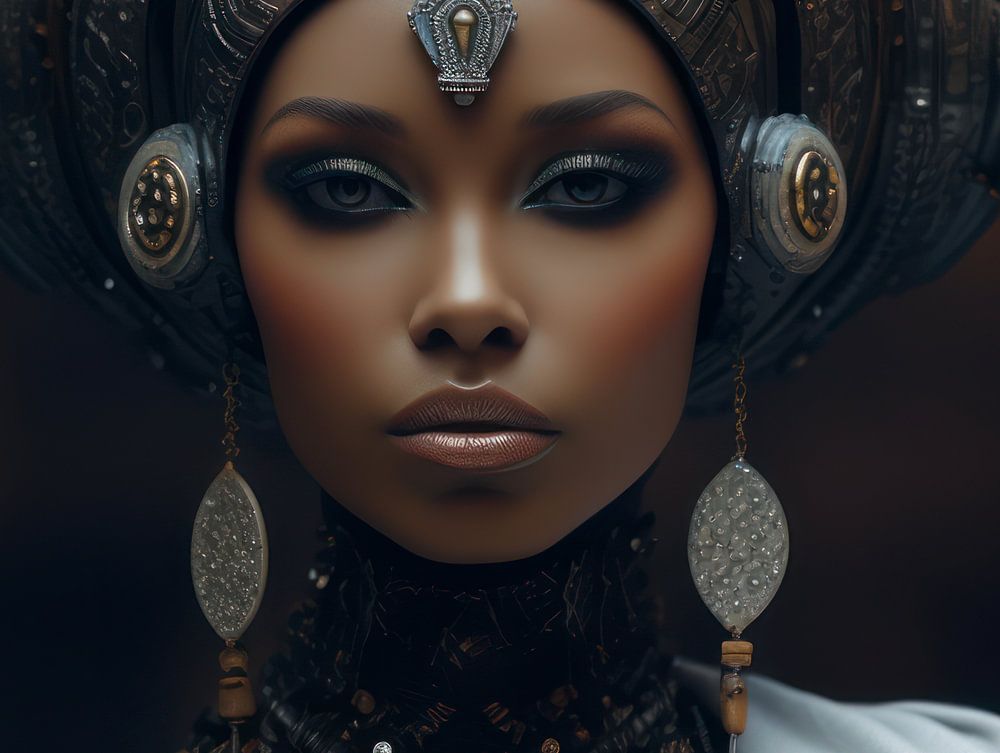 Beautiful African woman with headscarf. Gold jewellery covers her. It looks like an African Queen and also has a bit of Egyptian in it.